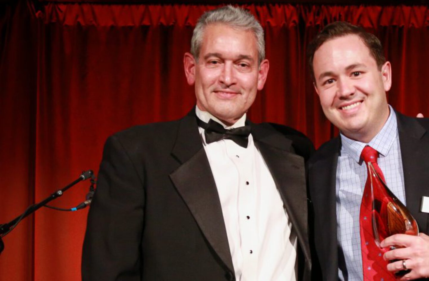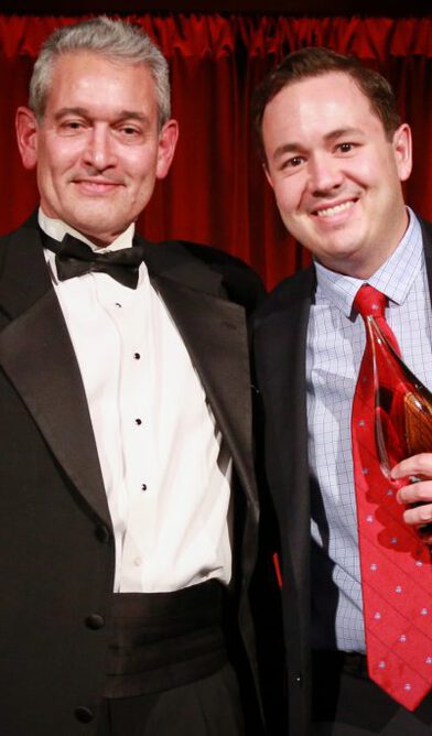 Ron Schneider (left), director for corporate governance services at DFIN, presents the award for best proxy statement (large cap) to John Kim, lead securities counsel at GM